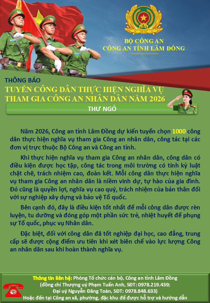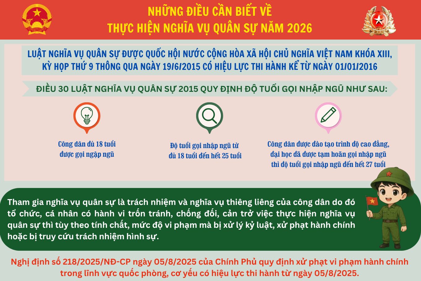 • CÔNG TÁC TUYỂN CHỌN, GỌI CÔNG DÂN NHẬP NGŨ VÀO QUÂN ĐỘI VÀ THỰC HIỆN NGHĨA VỤ THAM GIA CÔNG AN NHÂN DÂN NĂM 2026
